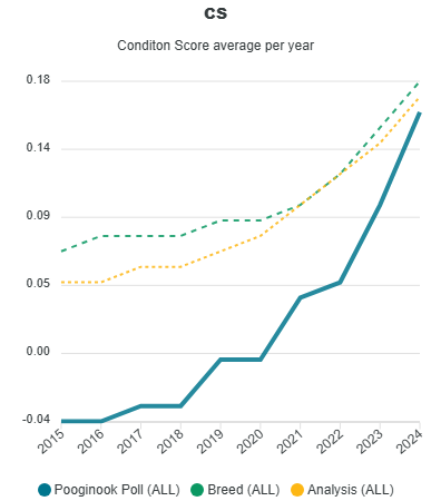 At Pooginook, we’re selecting for ewes that hold condition under pressure. Our 2030 target is to lift flock average condition score above +0.3 — producing sheep that keep doing their job with less input, even in challenging environments.